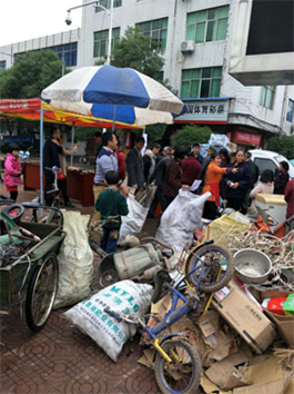 “你有废旧物品,我来绿色兑换”。在活动现场,彩旗飞扬,标语闪亮,人头拥簇,只见活动桌上,摆满了琳琅满目的生活用品,有芝蔴油、卫生纸、洗衣皂、清洁球、沐浴露……潢溪镇各村的村民们络绎不绝,排着长队挤在桌前,认真填写兑换表格,有序地兑换领取生活物品。活动桌左侧的空地上,堆放着村民找来的空水瓶、废纸箱、旧书本、破铜烂铁等废旧物品。
